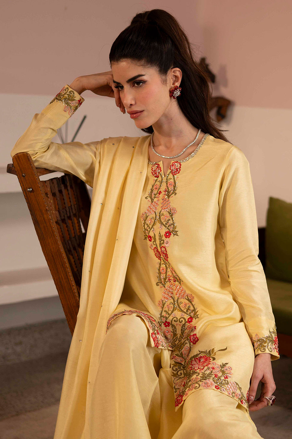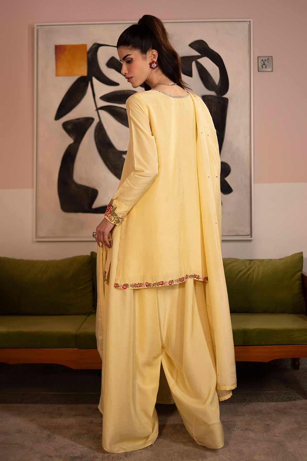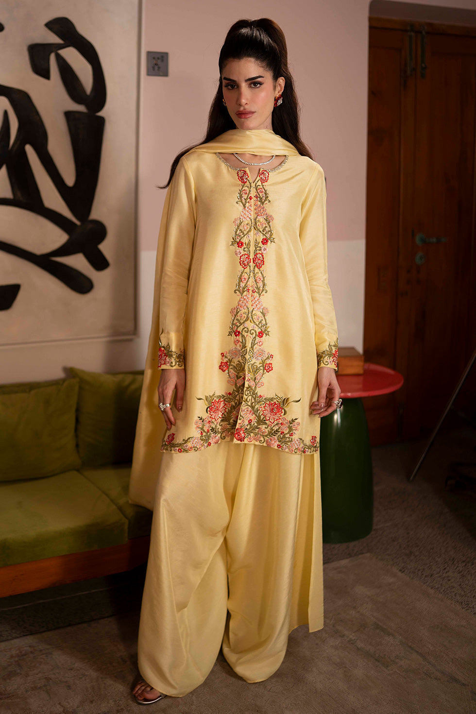 A luminous butter yellow korean silk ensemble featuring intricate thread embroidery and fine hand embellishment throughout. Paired with structured box pants, the silhouette offers a balance of softness and definition. A radiant expression of warmth and refined craftsmanship.