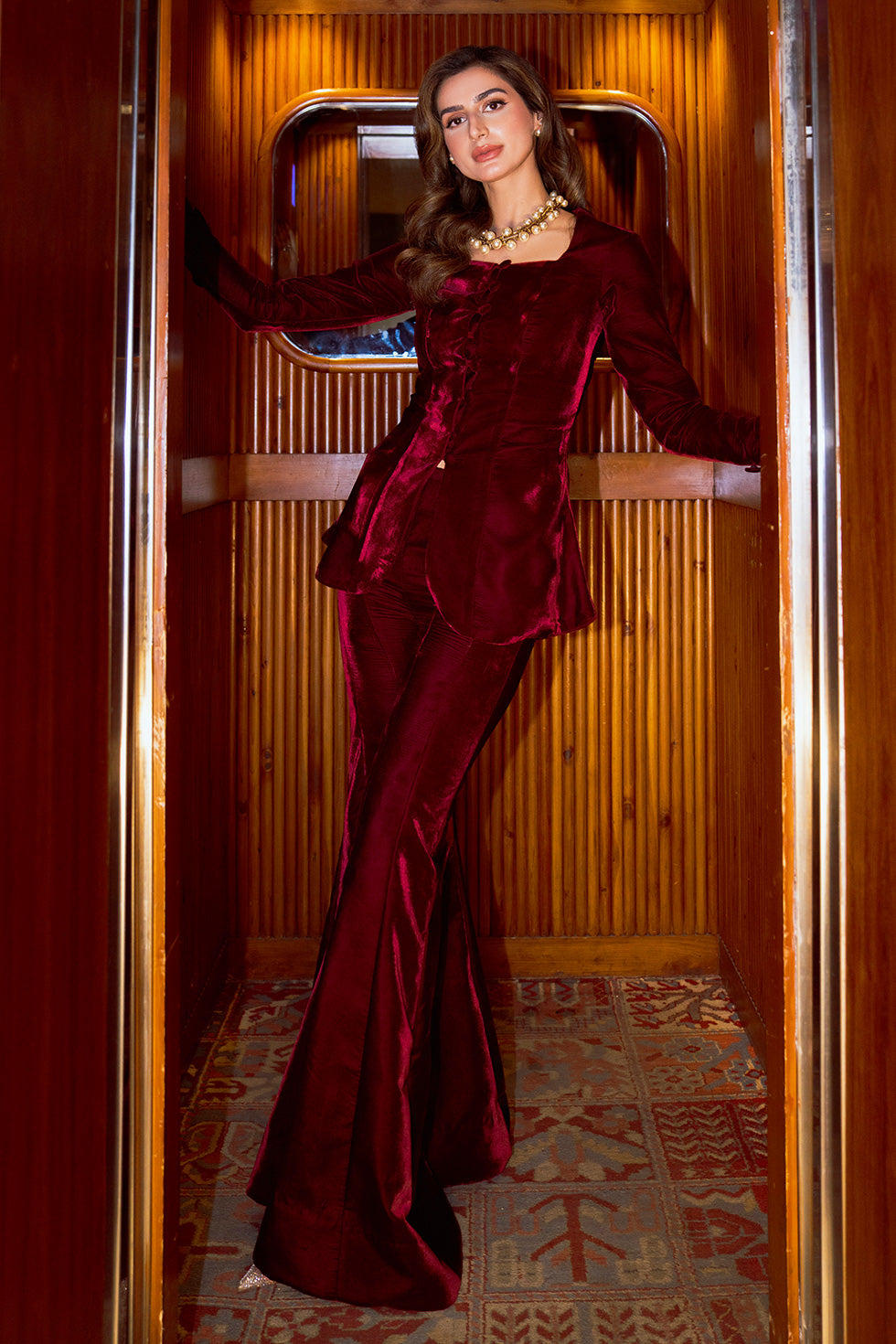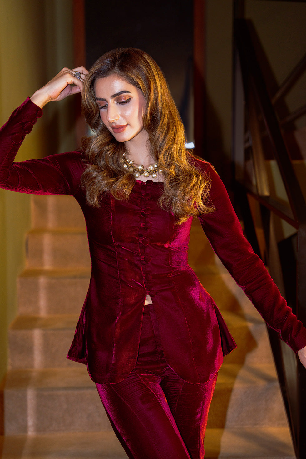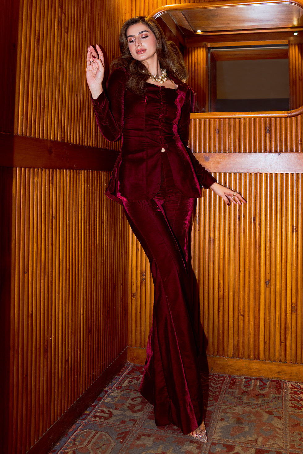 A rich maroon velvet co-ord set, tailored to perfection with delicate button and loop detailing along the front. Paired with gracefully flared velvet pants, the ensemble exudes classic sophistication with a touch of vintage charm. Every seam and detail is designed to celebrate timeless luxury and refined style