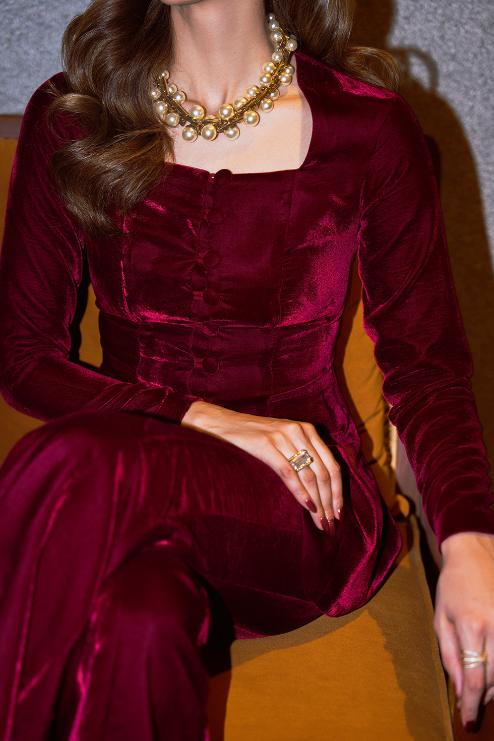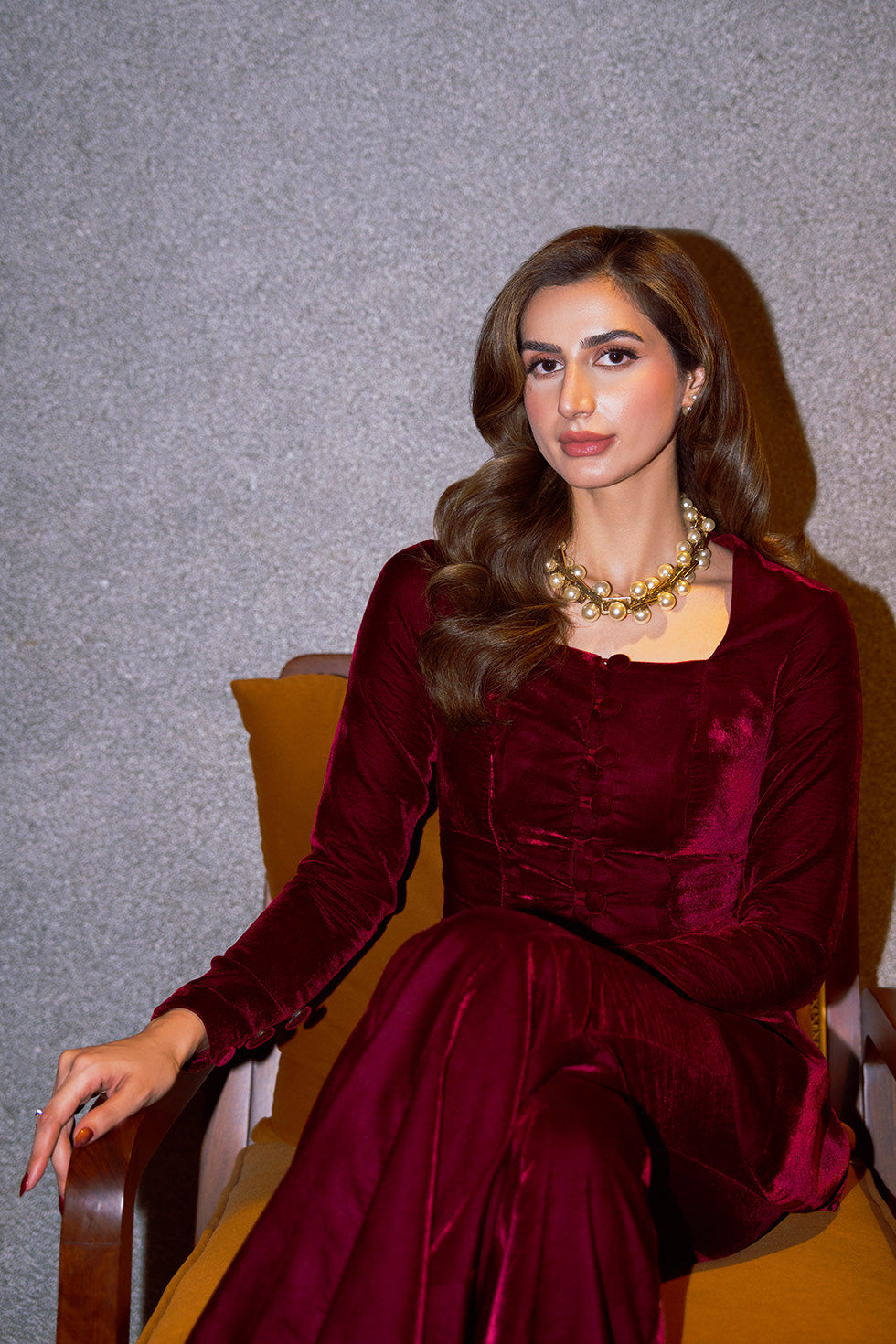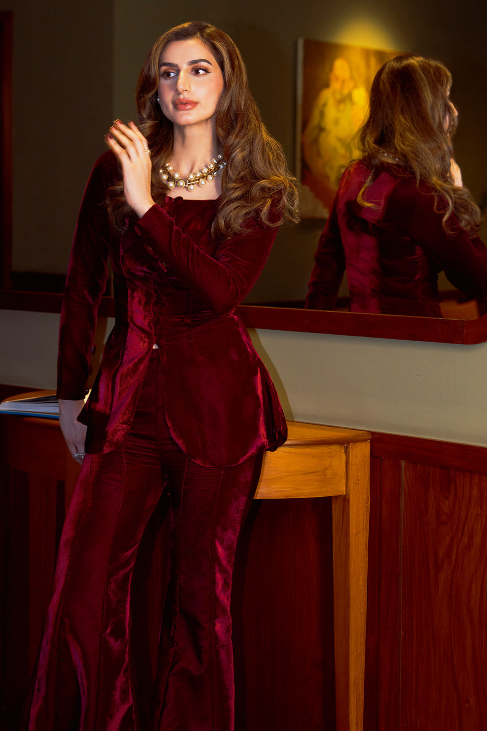 A rich maroon velvet co-ord set, tailored to perfection with delicate button and loop detailing along the front. Paired with gracefully flared velvet pants, the ensemble exudes classic sophistication with a touch of vintage charm. Every seam and detail is designed to celebrate timeless luxury and refined style