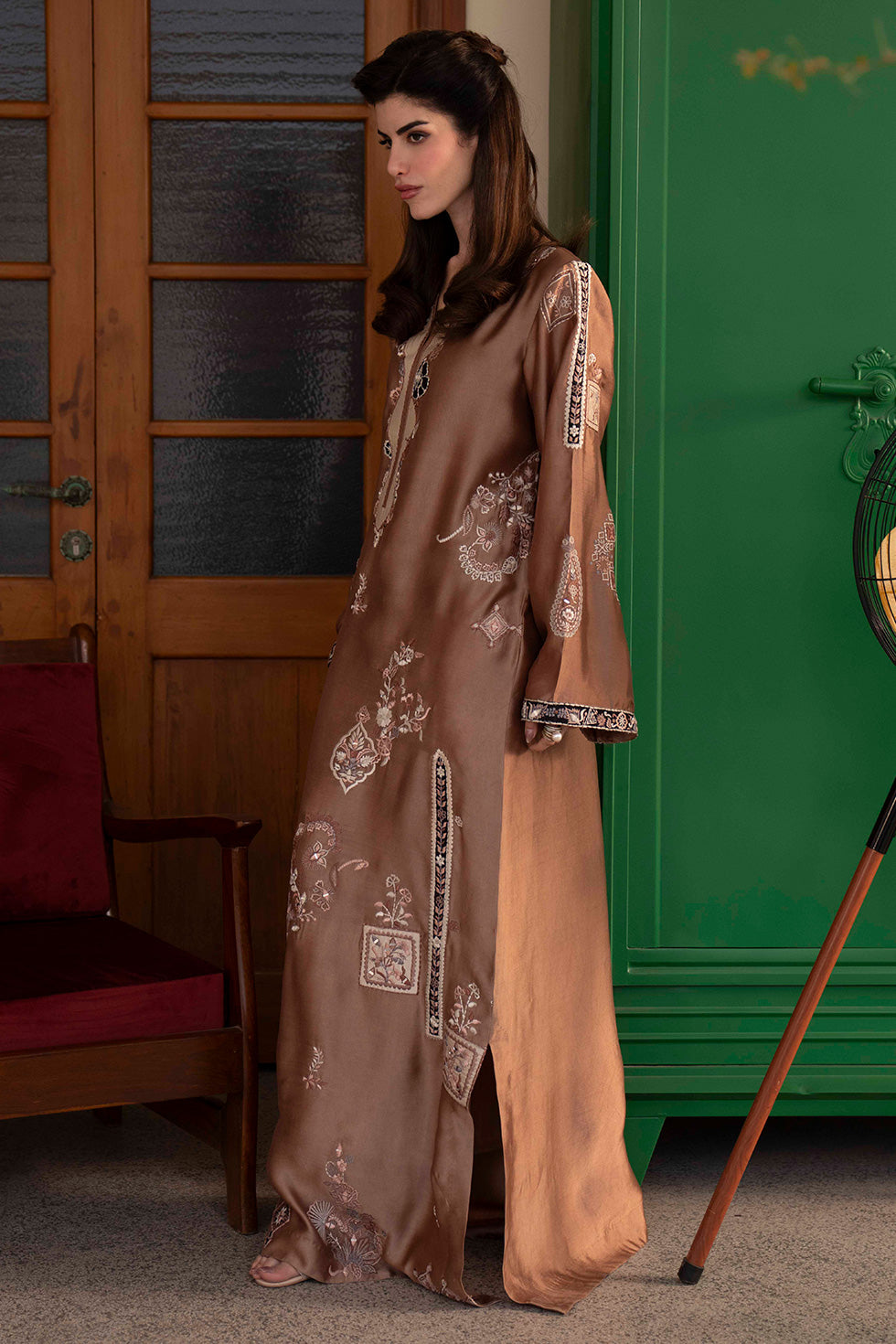 A warm brown pure sheesha silk kaftan featuring silk appliqué, fine thread embroidery, and shimmering sheesha work. The fluid silhouette allows the craftsmanship to take center stage, creating depth and texture throughout. A design rooted in tradition with a graceful contemporary feel.