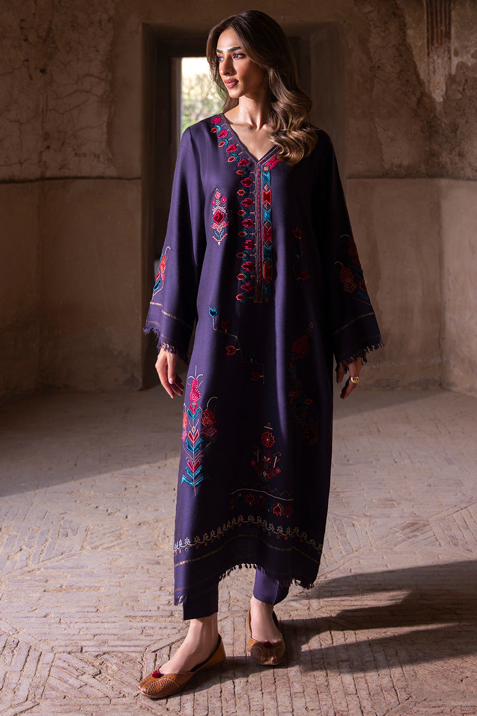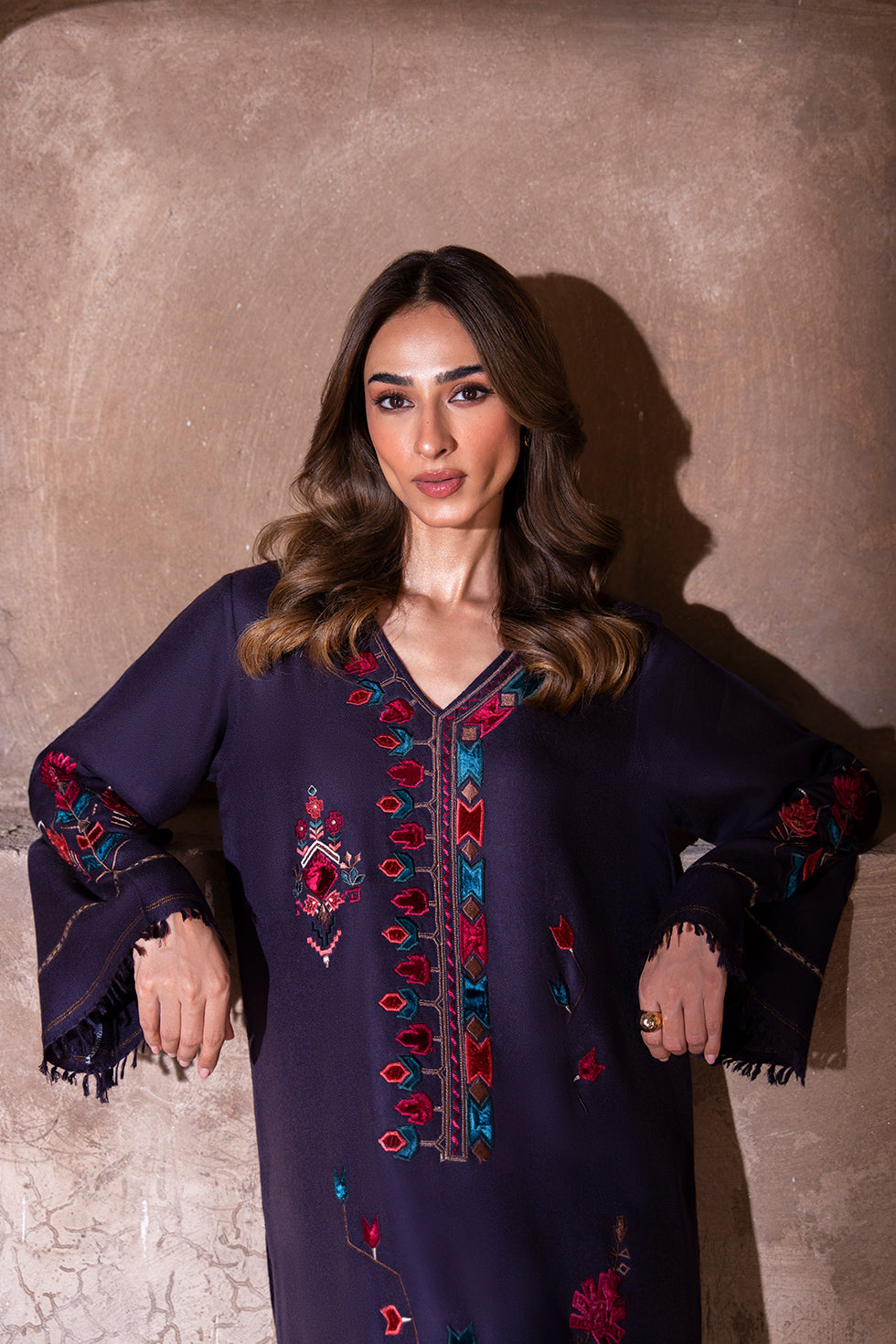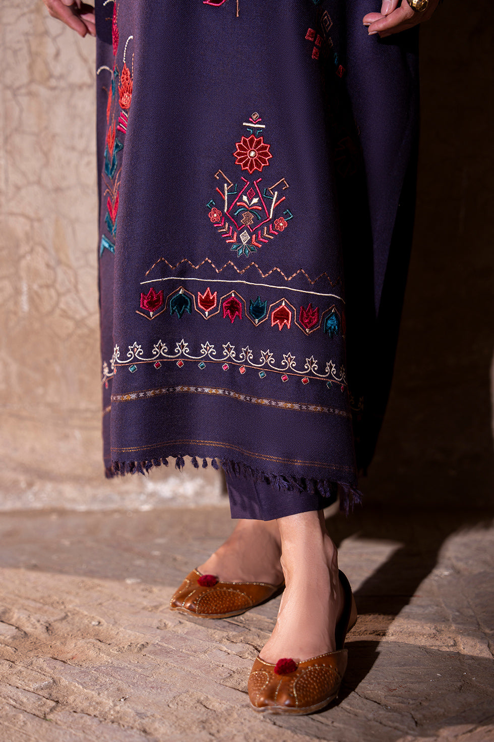 Kashmiri Tanka-inspired shawl kurta, crafted from luxurious Pashmina with resham thread work and velvet applique. Featuring elegant, unique motifs and patterns, this premium, soft fabric is paired with pure Karandi pants for a timeless, sophisticated look.
