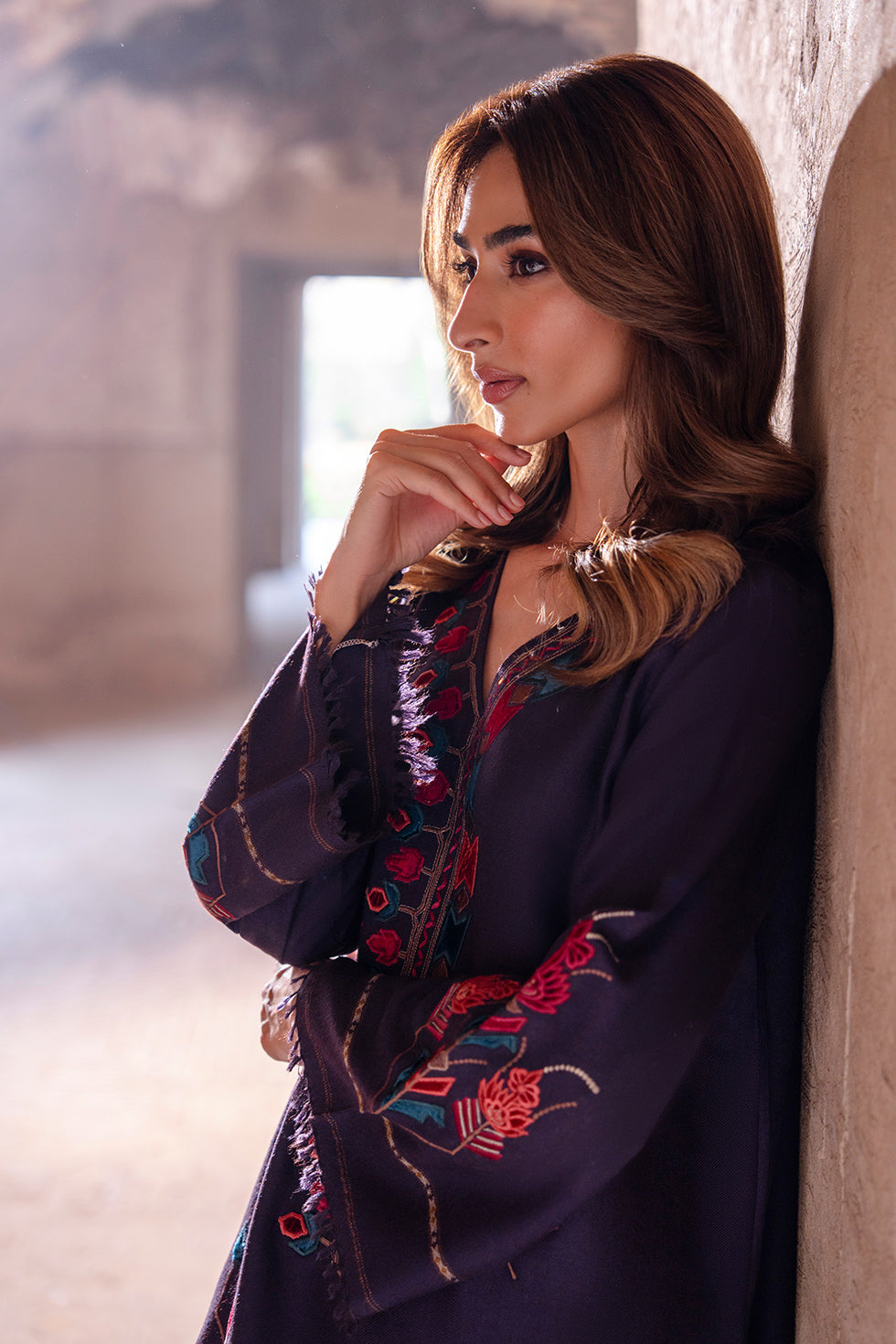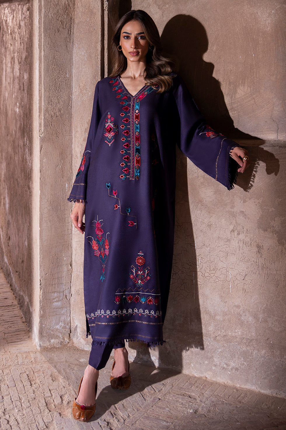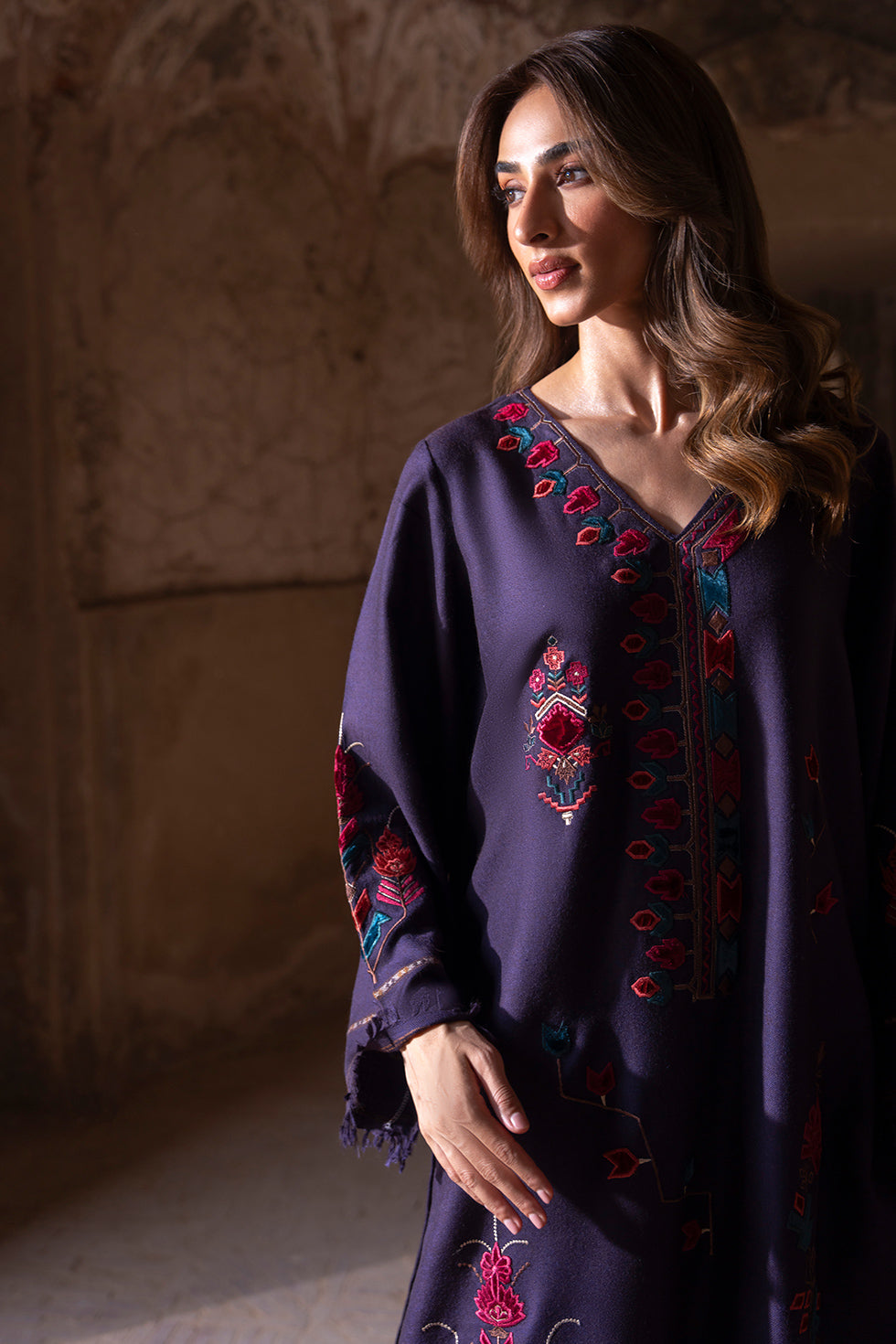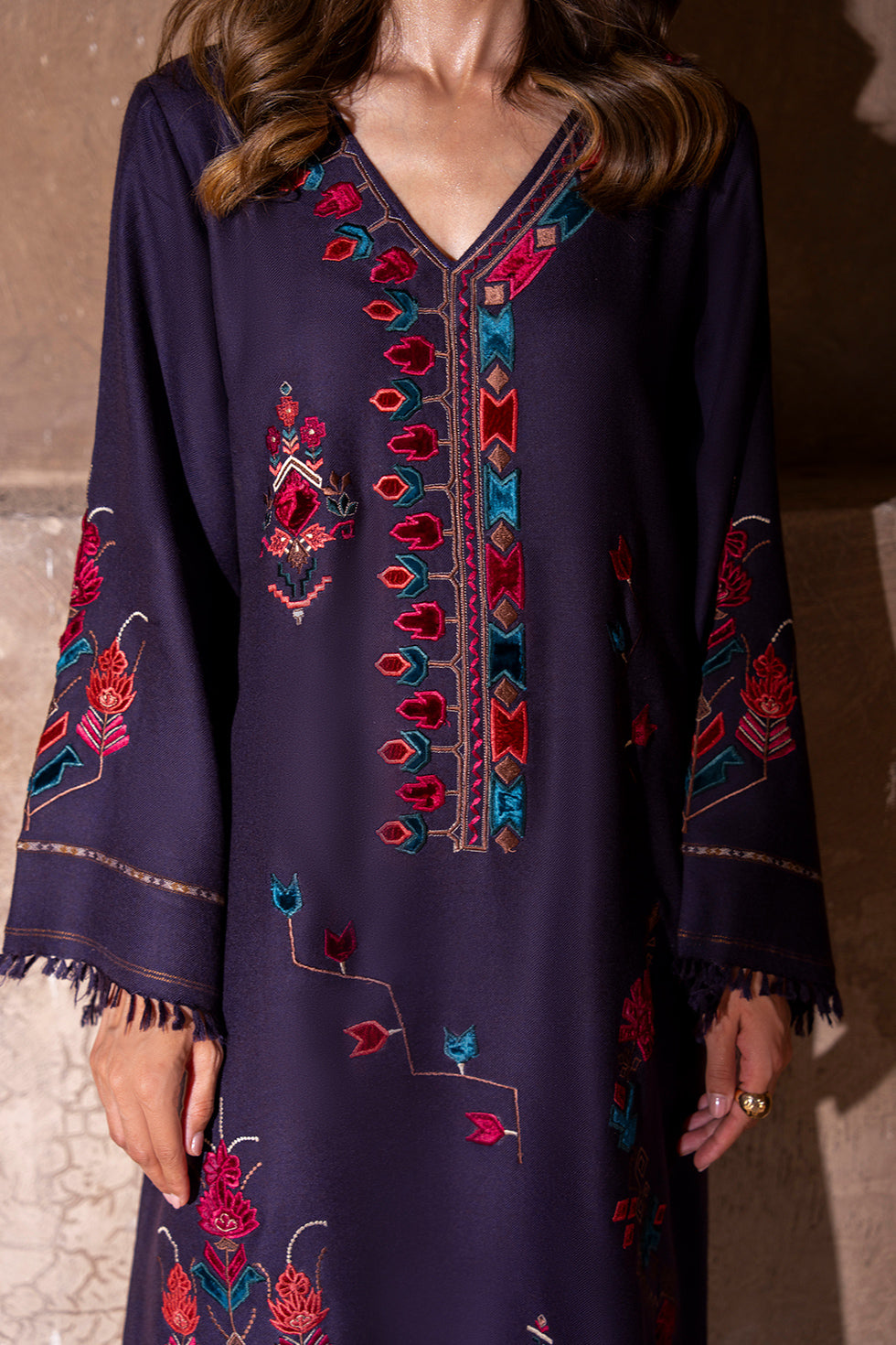 Kashmiri Tanka-inspired shawl kurta, crafted from luxurious Pashmina with resham thread work and velvet applique. Featuring elegant, unique motifs and patterns, this premium, soft fabric is paired with pure Karandi pants for a timeless, sophisticated look.