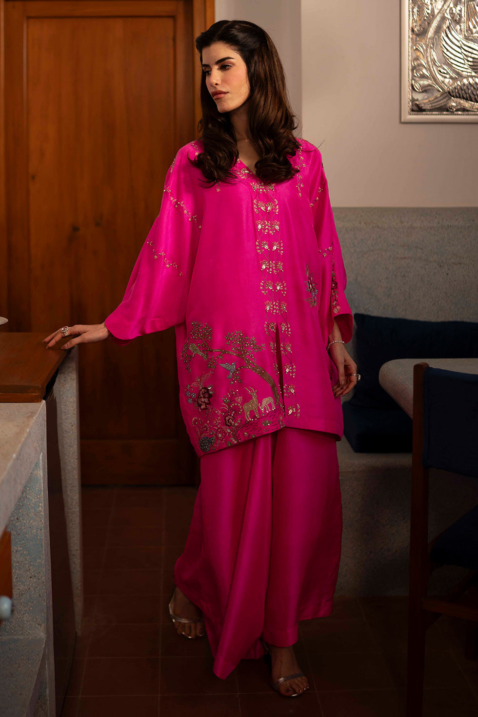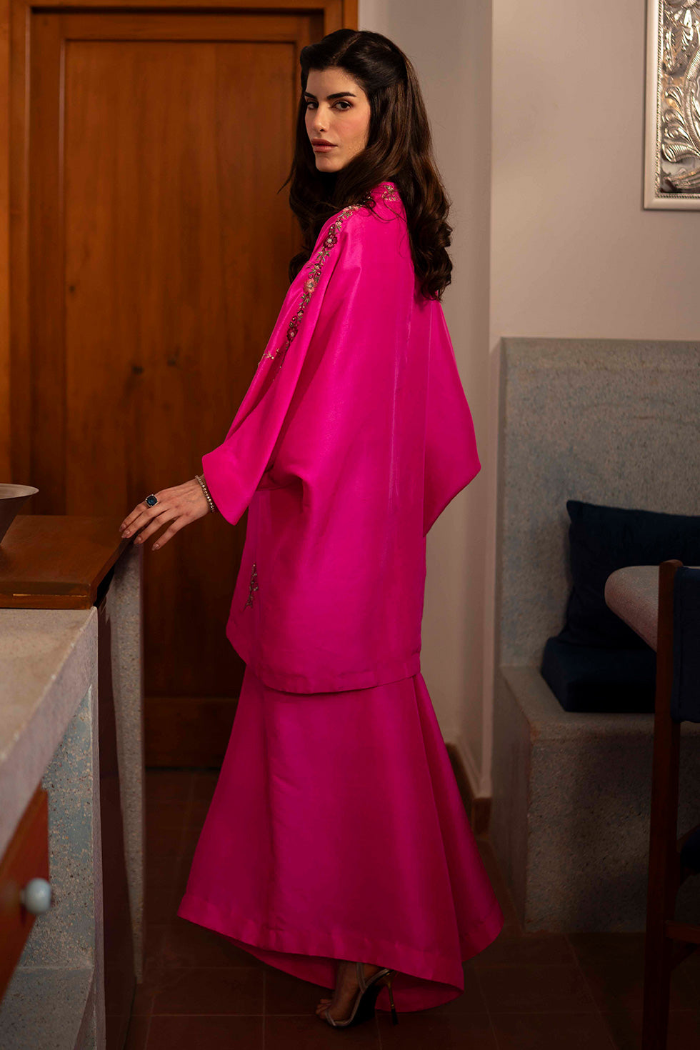 A striking shocking pink kaftan crafted from pure 80-gram raw silk, adorned with intricate hand embroidery and delicate hand embellishments. Paired with structured box pants, the silhouette blends fluidity with modern form. Rich craftsmanship and vibrant color come together in a statement of refined festivity.