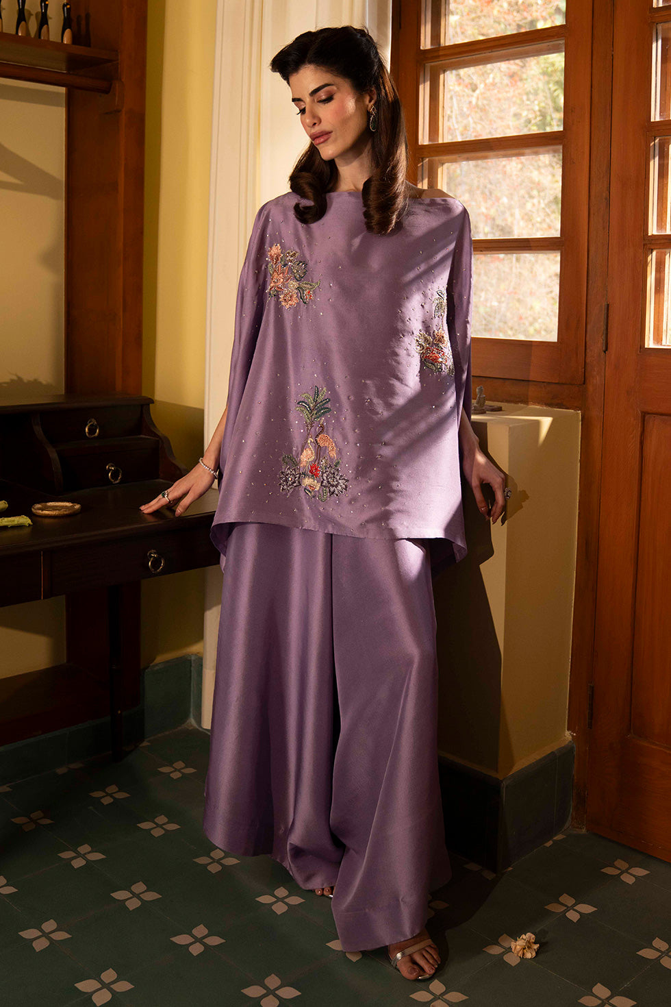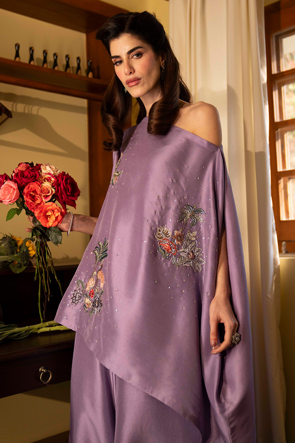 A lilac kaftan in pure 80-gram raw silk, adorned with fine thread embroidery and hand embellishment that catches the light with subtle brilliance. Paired with tailored box pants, the ensemble carries a gentle balance of structure and ease. A design that feels serene yet striking.