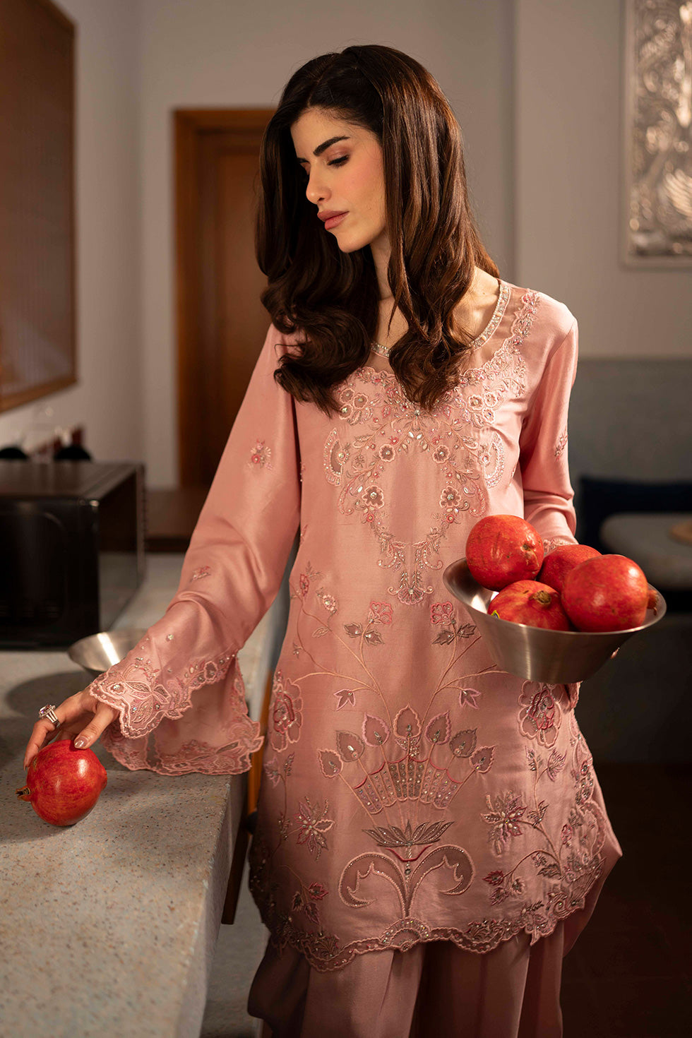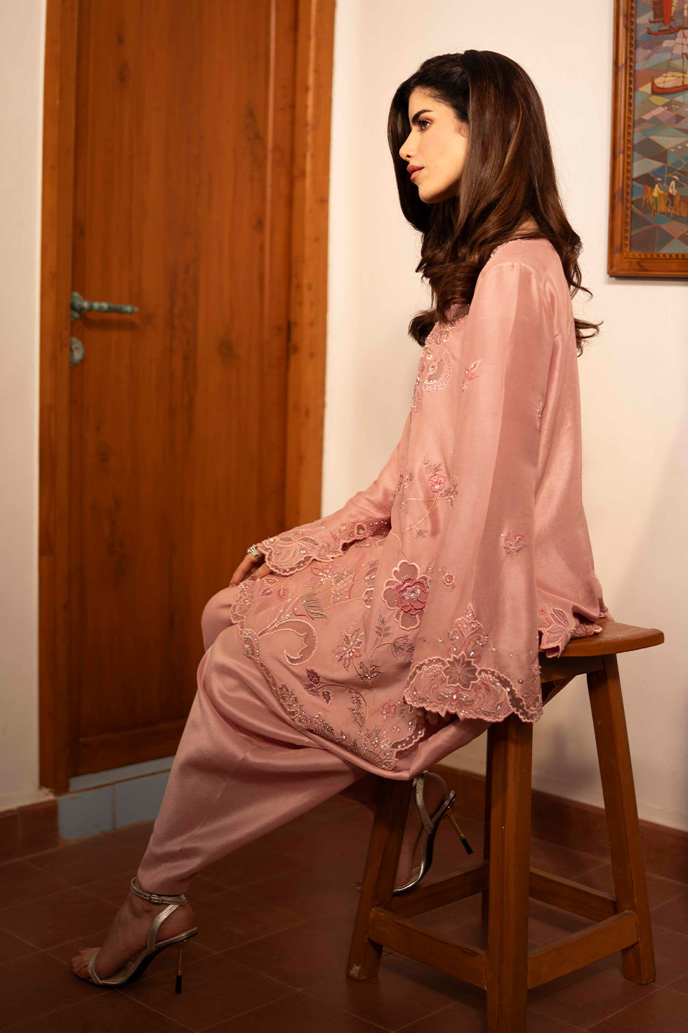 A soft pink shirt brought to life with intricate thread embroidery, organza appliqué, and detailed cutwork along the sleeves and back. Hand embellishments across the neckline and surface add depth and dimension. Every element reflects careful artistry and graceful femininity.
