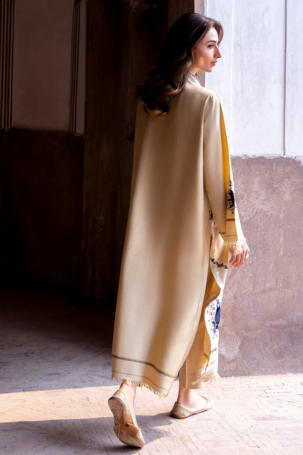 Kashmiri Tanka-inspired shawl kurta, crafted from luxurious Pashmina with resham thread work and velvet applique. Featuring elegant, unique motifs and patterns, this premium, soft fabric is paired with pure Karandi pants for a timeless, sophisticated look.