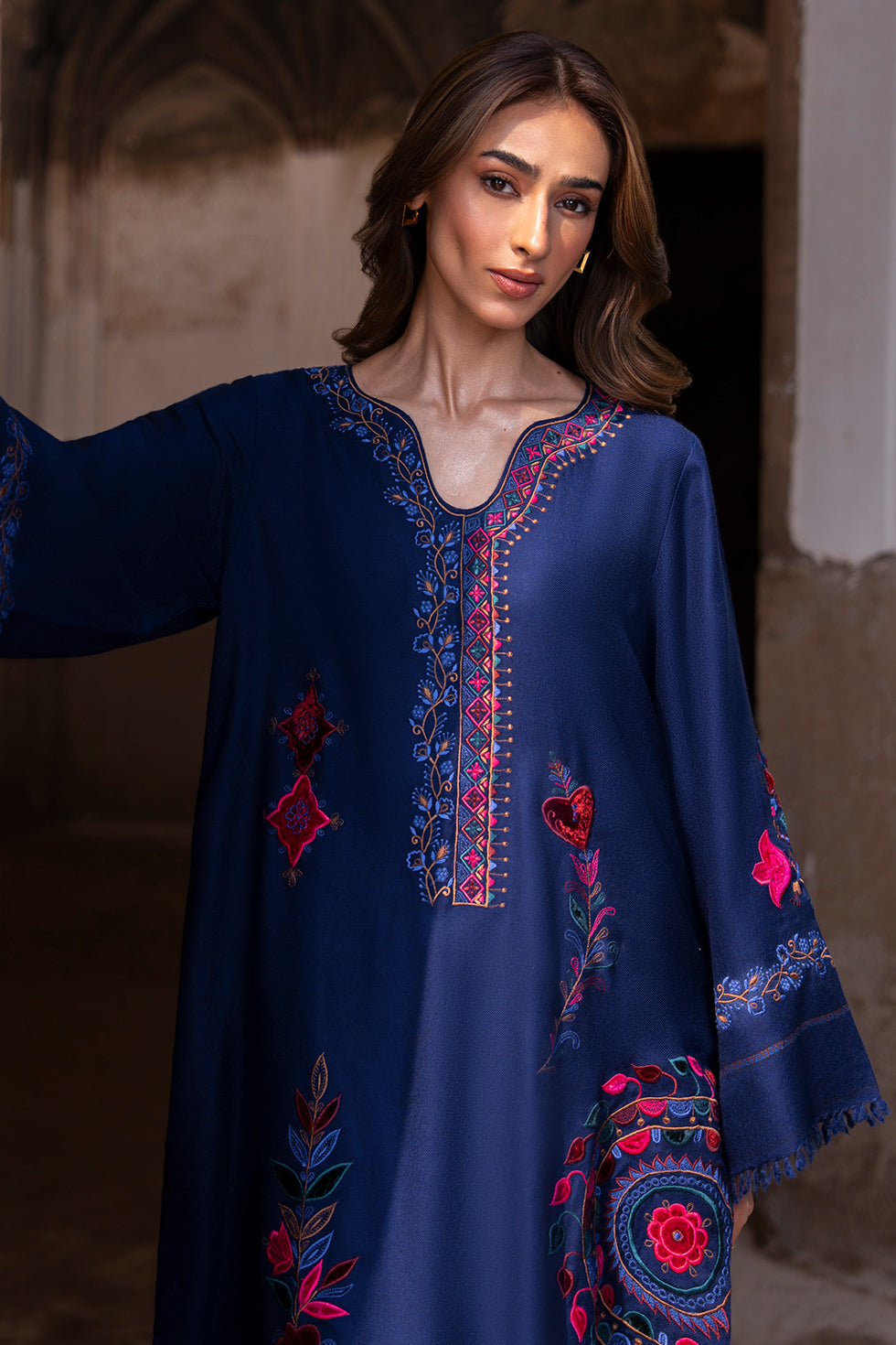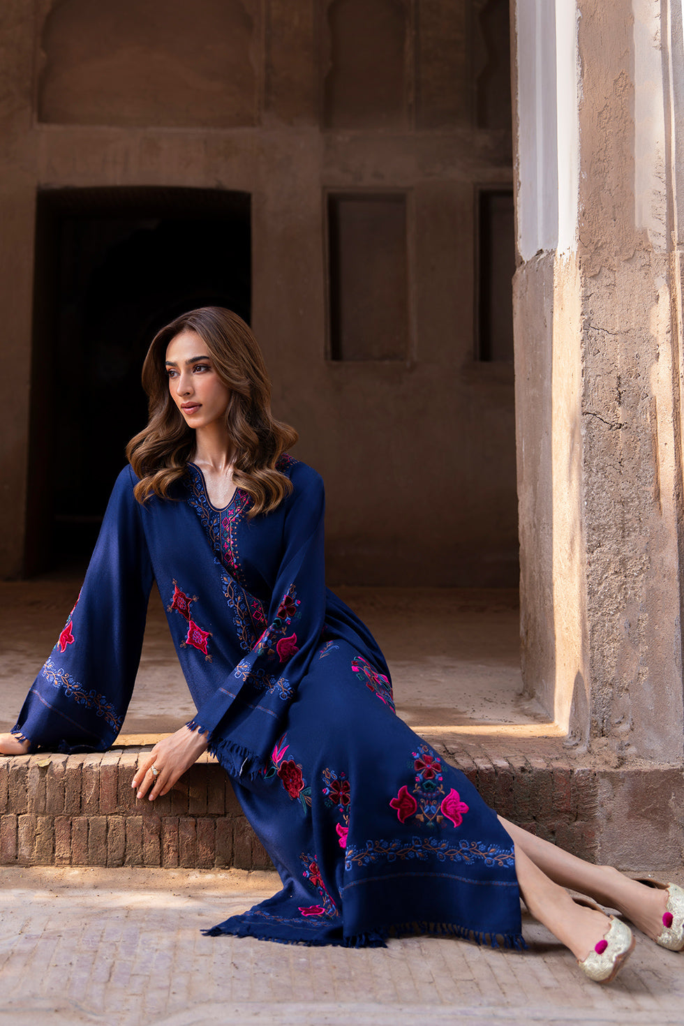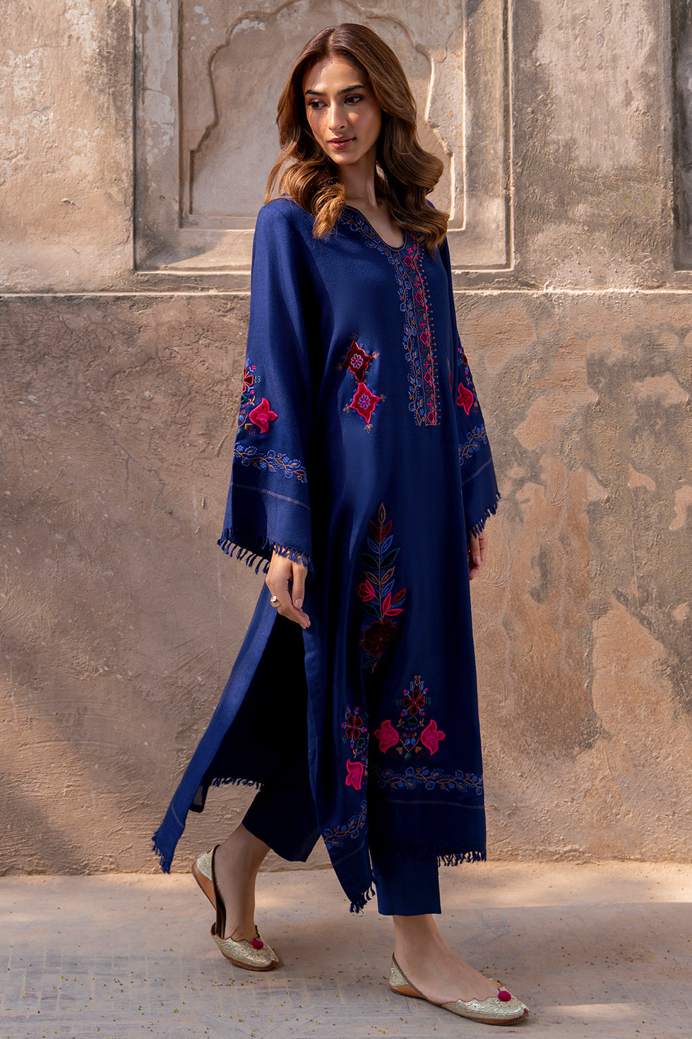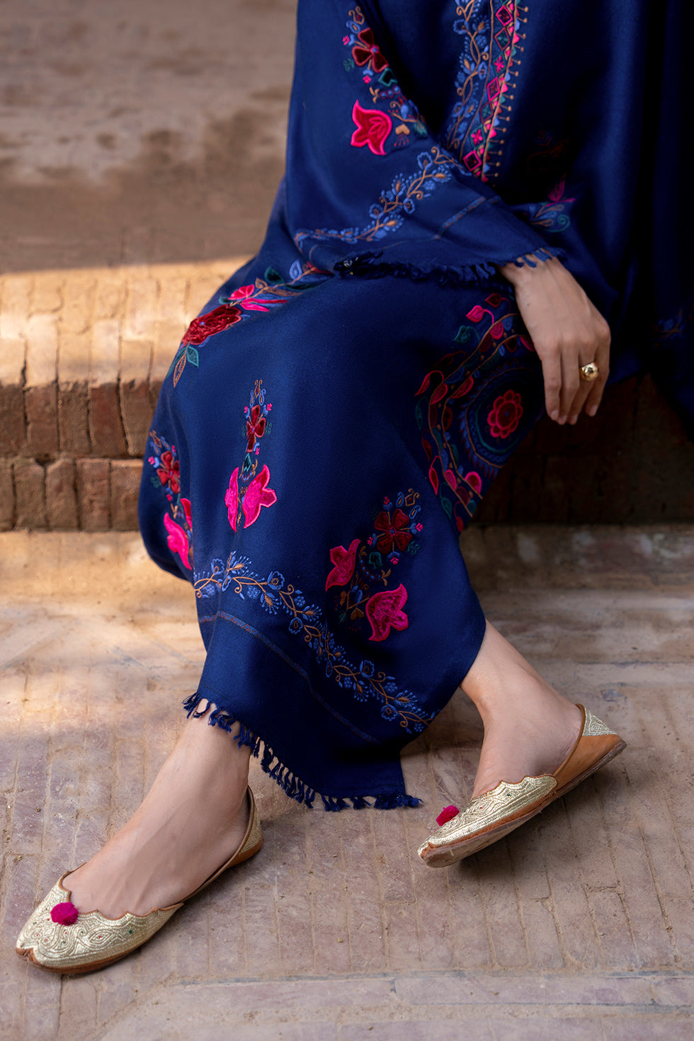 Kashmiri Tanka-inspired shawl kurta, crafted from luxurious Pashmina with resham thread work and velvet applique. Featuring elegant, unique motifs and patterns, this premium, soft fabric is paired with pure Karandi pants for a timeless, sophisticated look.