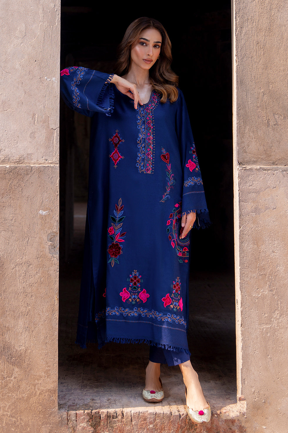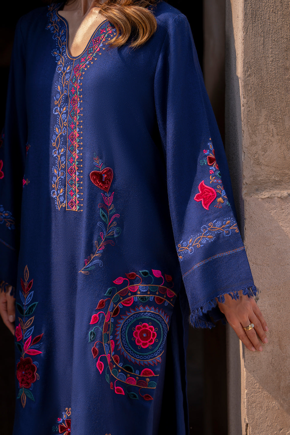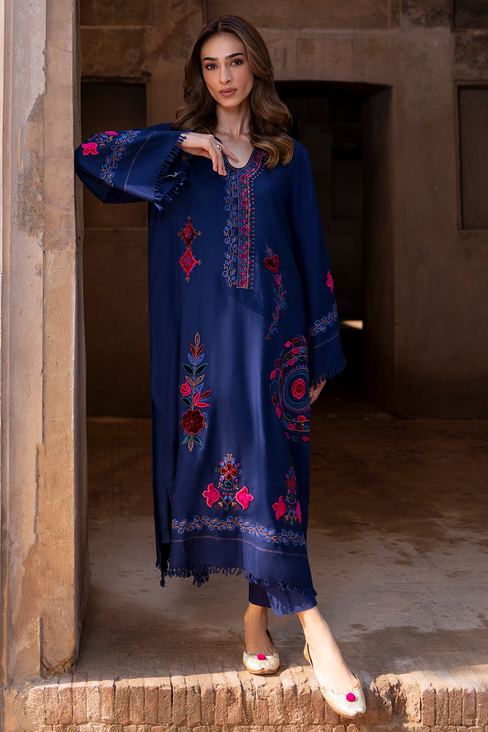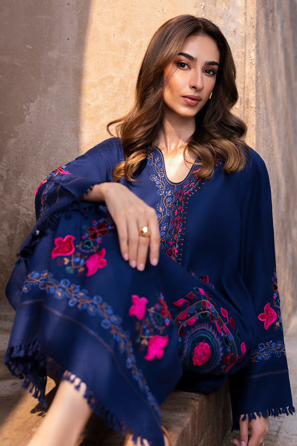 Kashmiri Tanka-inspired shawl kurta, crafted from luxurious Pashmina with resham thread work and velvet applique. Featuring elegant, unique motifs and patterns, this premium, soft fabric is paired with pure Karandi pants for a timeless, sophisticated look.