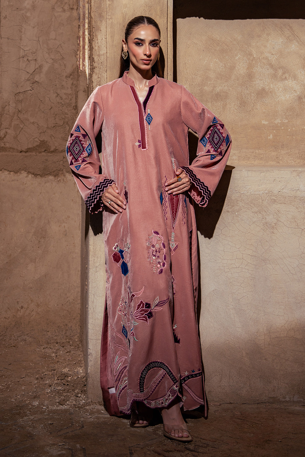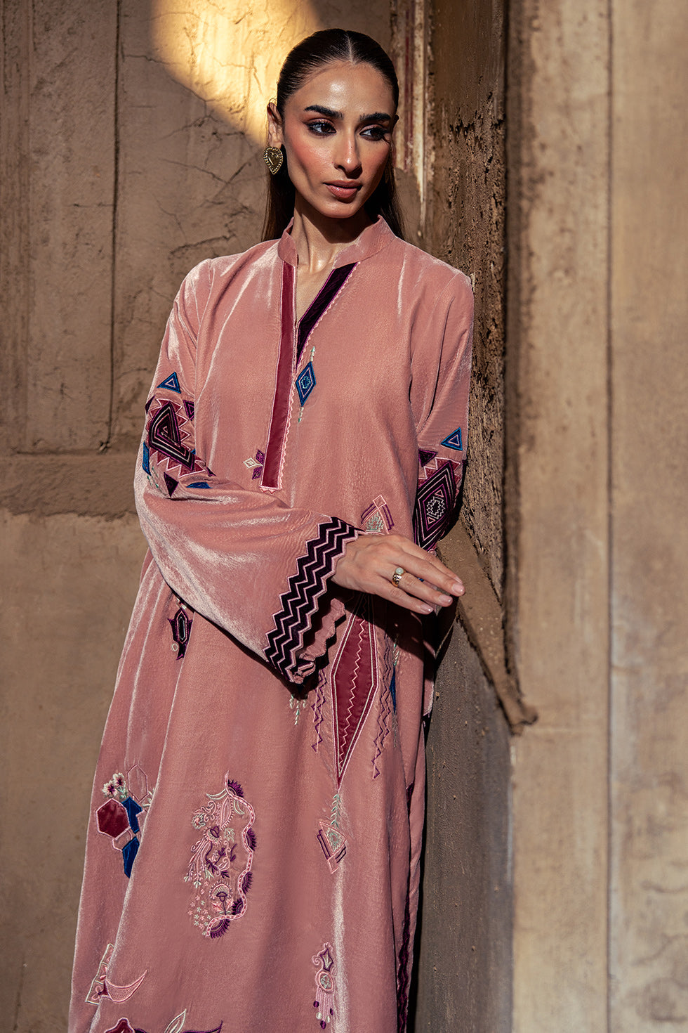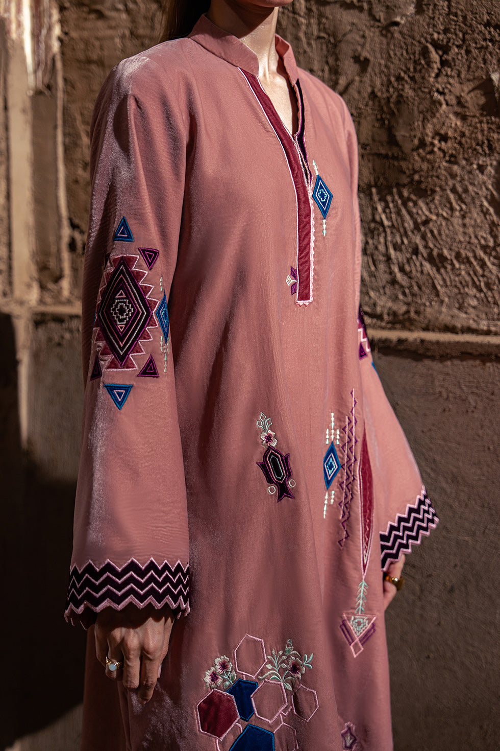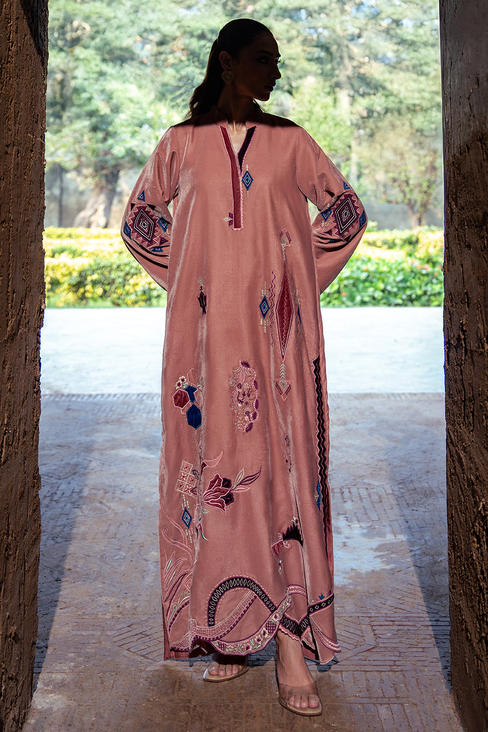 A soft light pink velvet kaaftan shirt, adorned with intricate resham thread work and subtle velvet appliqués along the neckline and sleeves. Its graceful silhouette and delicate detailing make it a statement of refined elegance. Ideal for occasions where understated sophistication shines