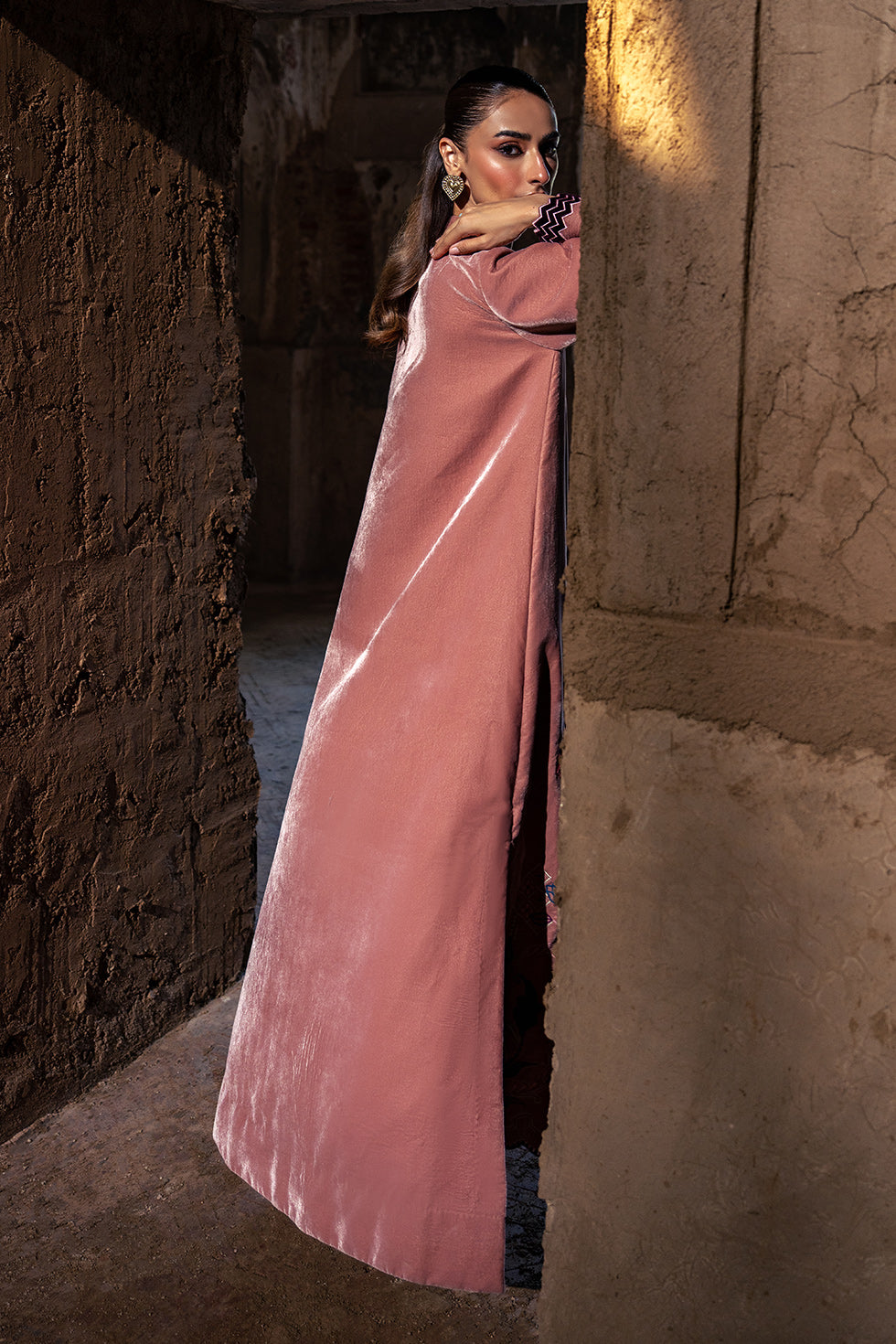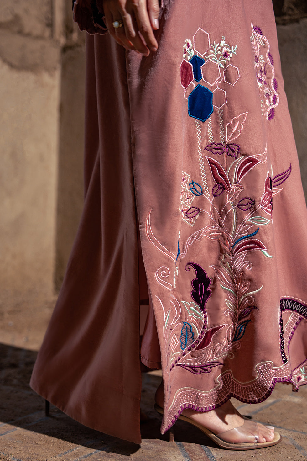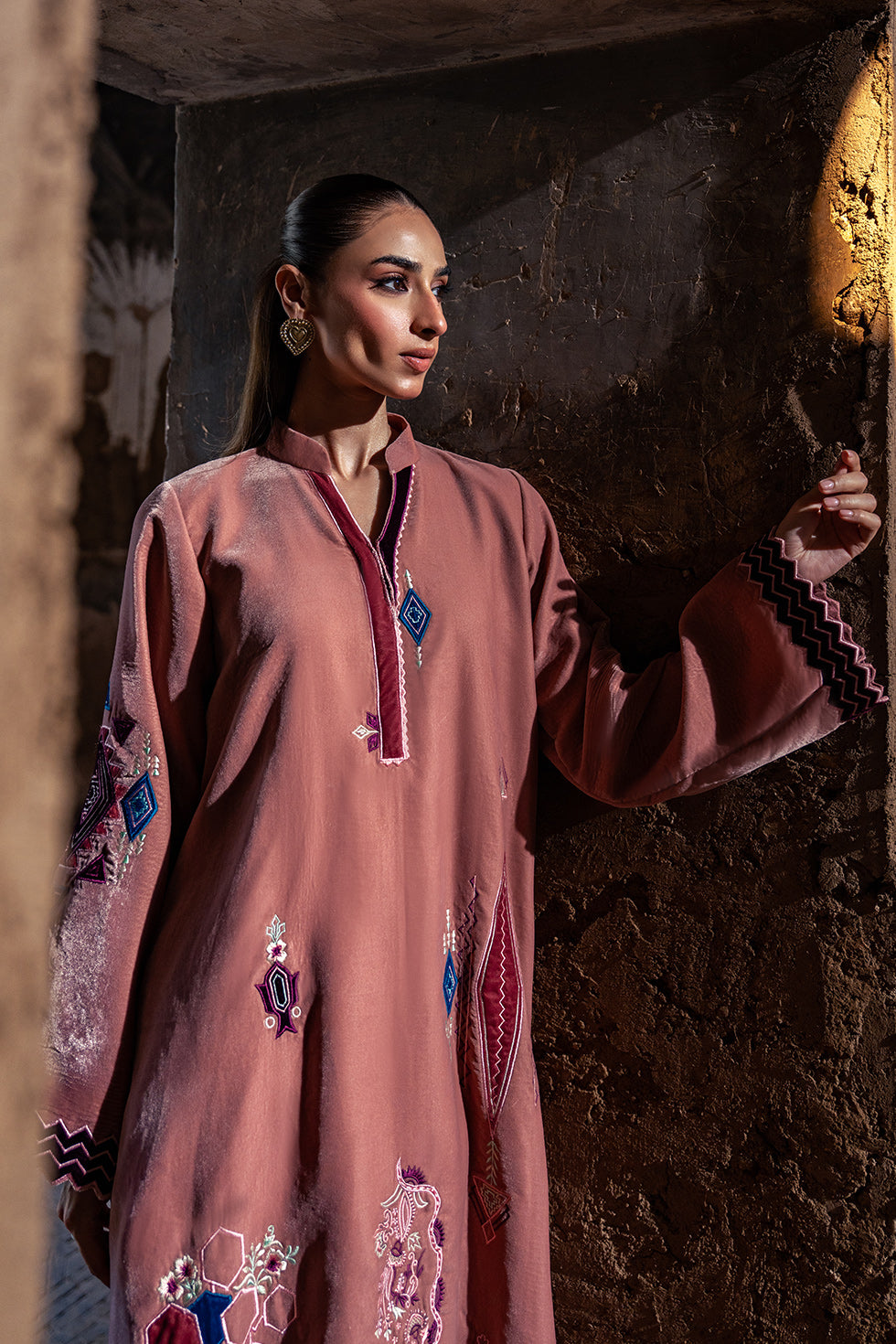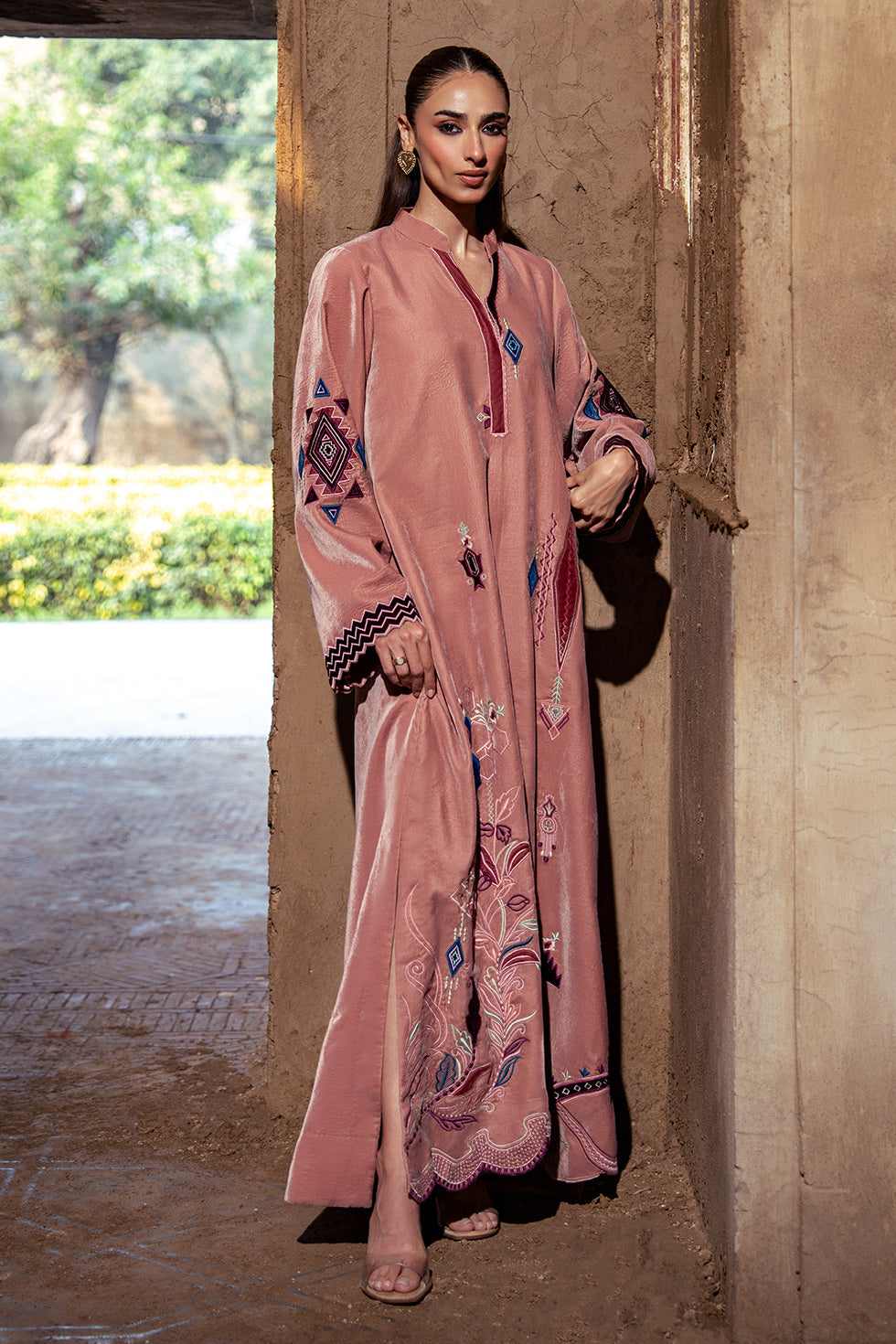 A soft light pink velvet kaaftan shirt, adorned with intricate resham thread work and subtle velvet appliqués along the neckline and sleeves. Its graceful silhouette and delicate detailing make it a statement of refined elegance. Ideal for occasions where understated sophistication shines